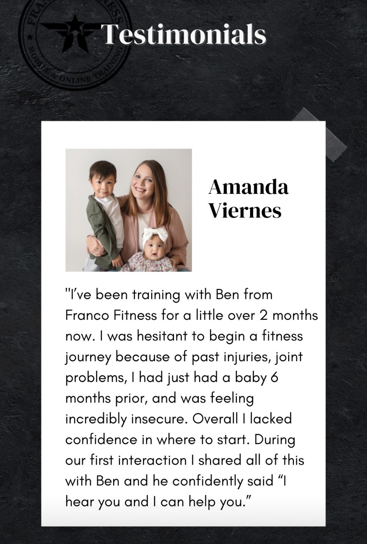 "I was hesitant to begin a fitness journey because of past injuries, joint problems, I had just had a baby 6 months prior, and was feeling incredibly insecure. Ben confidently said 'I hear you and I can help you.'"