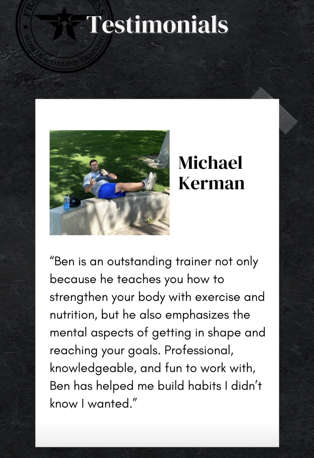 "Ben is an outstanding trainer. He teaches you how to strengthen your body with exercise and nutrition, but also emphasizes the mental aspects of getting in shape."